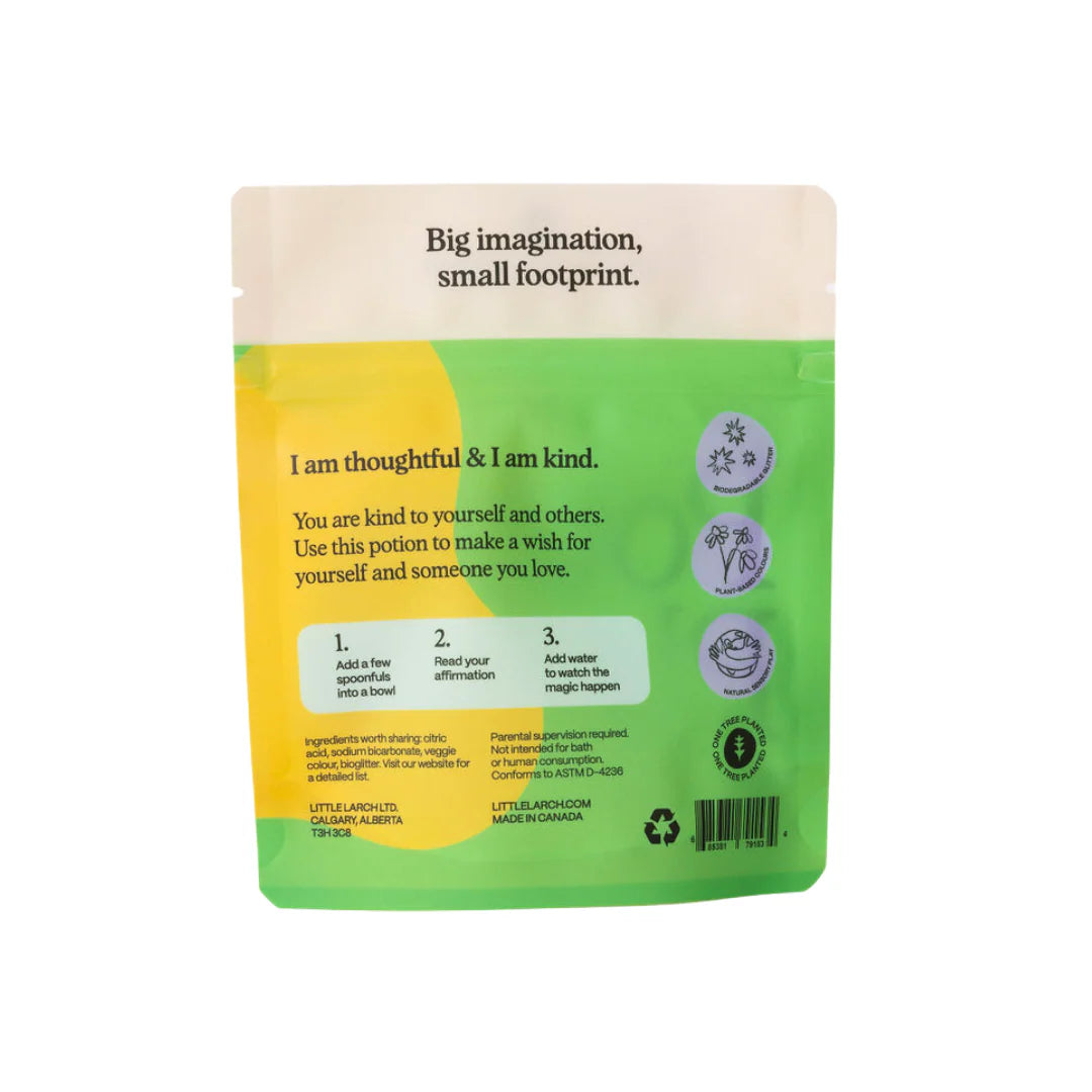 Cette potion magique pétillante stimule des jeux aquatiques conscients. Le sortilège souhait aide les enfants à répandre la gentillesse grâce à un vœu magique. Il leur demande de faire un vœu pour eux-mêmes et pour quelqu'un qu'ils aiment.