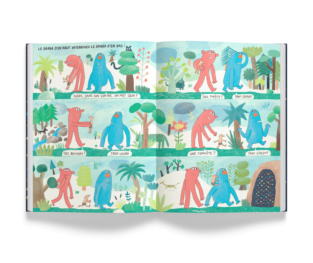 Le Dabba d’en haut et le Dabba d’en bas sont frères. Ensemble, ils ont créé le monde, son ciel, ses montagnes et les bêtes qui l’habitent. Une nuit, ils créent ensemble une « drôle de bête » qui n’a ni crocs, ni écailles, ni griffes, ni plumes et invitent les autres créatures à donner leur avis. Mais à quoi donc servirait cette drôle de bête, se demandent-elles?