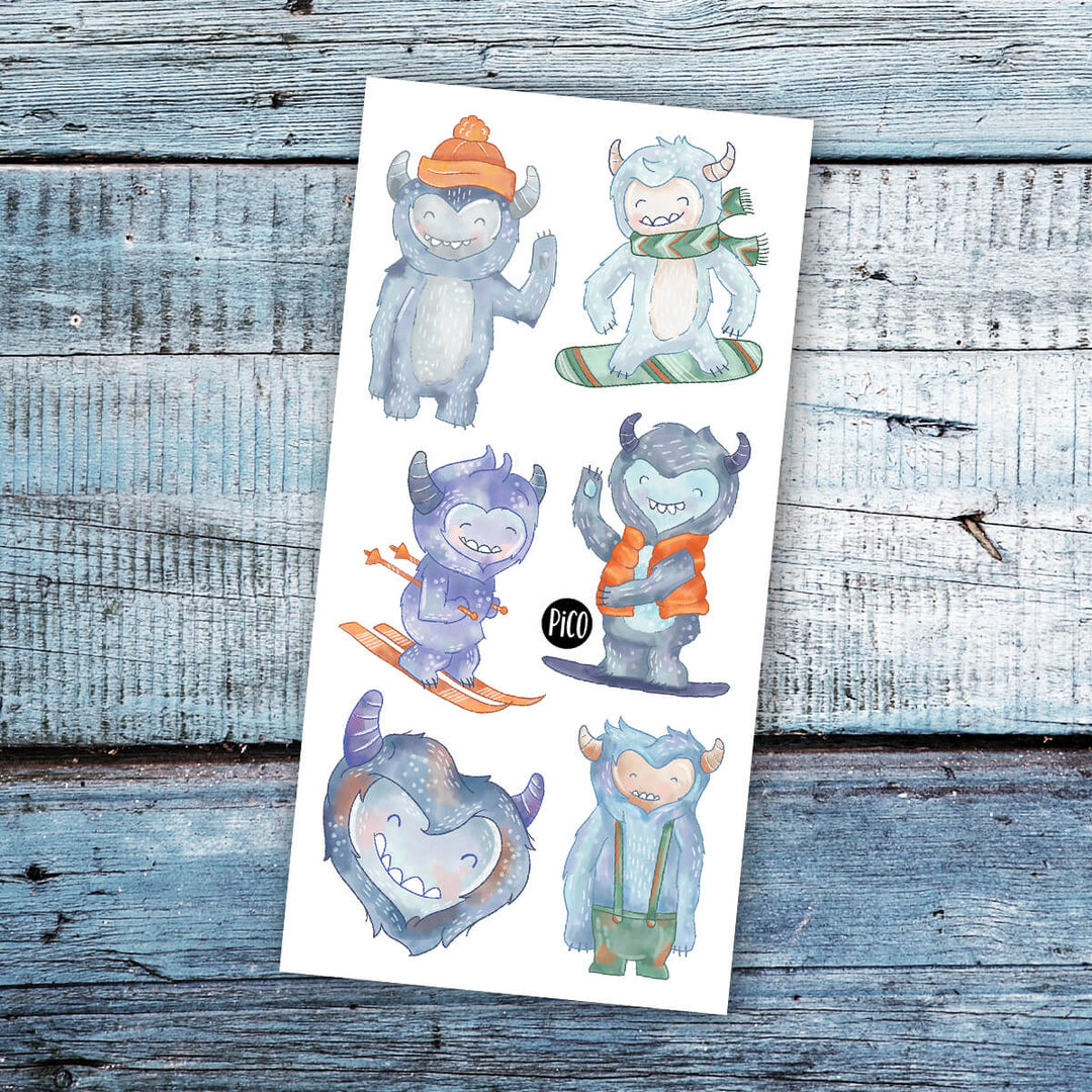 Tatouages temporaires du Yéti en ski pour s'amuser et décorer votre corps avec des personnages adorables.