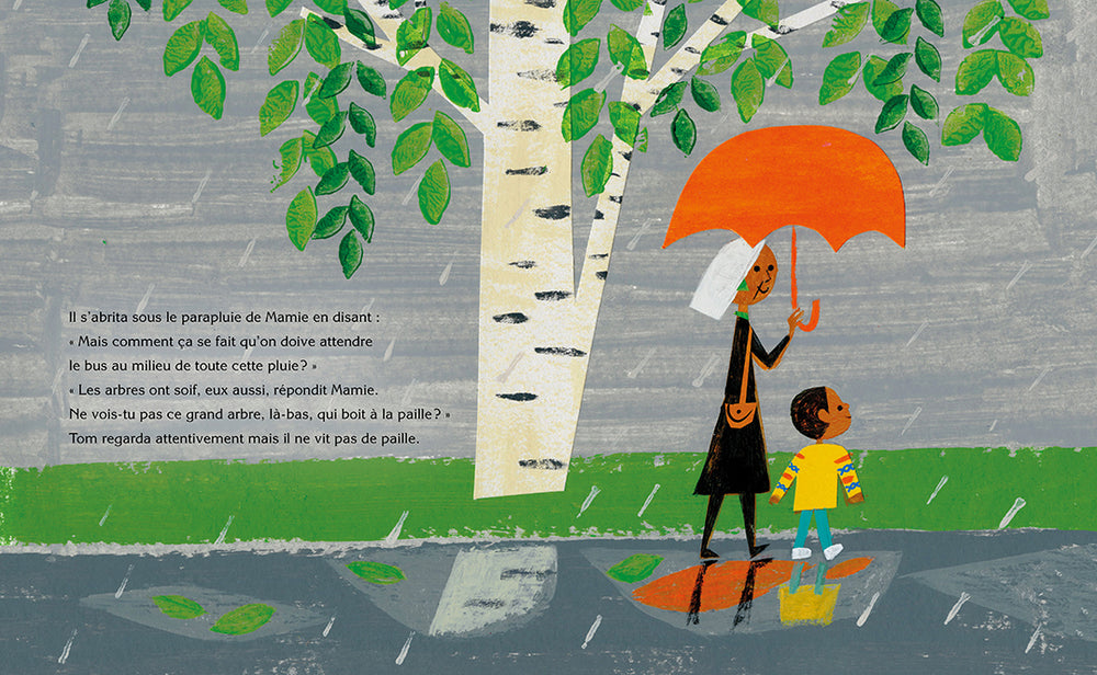 Chaque dimanche, Tom et sa mamie traversent la ville en bus, jusqu’au terminus. Mais aujourd’hui, Tom traîne des pieds. Pourquoi doit-il attendre le bus sous la pluie ? Pourquoi doit-il toujours aller là-bas ? Pourquoi certains ont ceci ou cela et pas lui ?