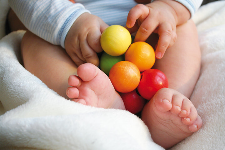 The Rainbow Beads Grasper is a classic and fun rattle that can double as a teething toy. Its shape is ideal to develop younger baby's motor skills when they are learning to grasp and handle things. When shaken, the Bead Grasper also makes a pleasant rattling sound.